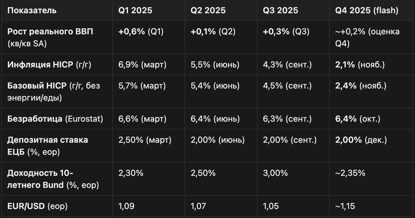 Экономика еврозоны в 2025 году выросла лишь умеренно, превзойдя худшие сценарии (нормирование энергии или глубокая рецессия), но оставаясь вялой. Реальный ВВП 20-страновой еврозоны вырос примерно на 1,0–1,2% за год (среднегодовой темп). Рост был «фронт-лоадед»: после плоской второй половины 2024 года еврозона ускорилась до +0,6% кв/кв в Q1 2025 (на фоне улучшения ситуации с энергией и частичного отскока промышленности Германии). Однако затем импульс ослаб: ВВП Q2 +0,1% кв/кв и Q3 +0,3% кв/кв (немного лучше прогнозов +0,2%). К Q4 высокочастотные данные указывали на дальнейший рост в режиме «устойчиво, но вяло», при этом декабрьский композитный PMI был 51,9 (рост есть, но темпы на минимуме за 3 месяца) и был подавлен слабостью промышленности. В уровневом выражении ВВП еврозоны сейчас примерно на 6,5% выше допандемического уровня (Q4 2019), опережая Великобританию, но все еще уступая США (на 13% выше).