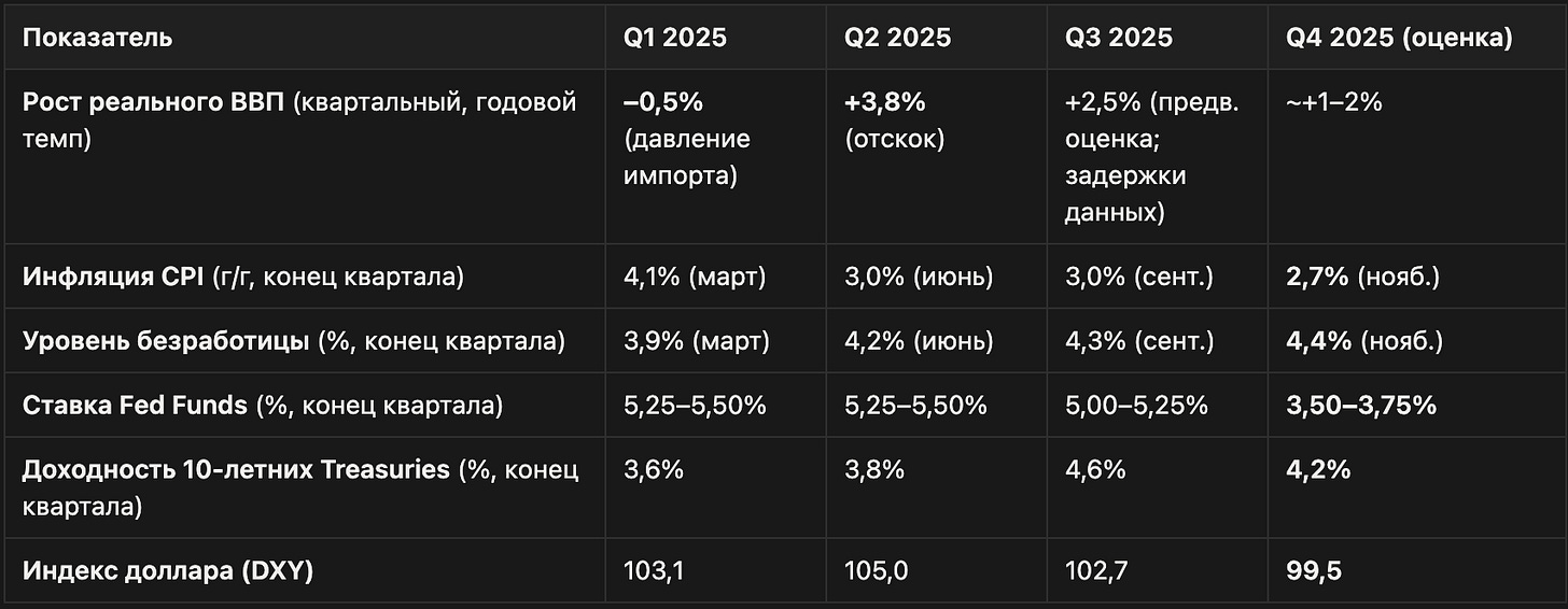 Экономика США продемонстрировала неожиданную устойчивость в течение 2025 года, хотя квартальный профиль был неровным. Реальный ВВП сократился на –0,5% в годовом выражении в Q1 — это было первое снижение с 2022 года — в значительной степени из-за скачка импорта на 37,9% в преддверии новых тарифов, что вычло около 4,7 п.п. из роста ВВП в первом квартале. Дополнительным негативным фактором стало сокращение федеральных расходов (–4,6% кв/кв). При этом потребительские расходы и инвестиции бизнеса в начале 2025 года оставались положительными (потребление в Q1 +0,5% кв/кв). Далее импортный «навес» был отыгран: во Q2 ВВП восстановился на +3,8% (SAAR), так как вклад чистого экспорта и запасов стал резко положительным. В Q3 рост замедлился примерно до +2,5% (предварительная оценка), однако по официальным оценкам базовая динамика оставалась «устойчивой». По итогам года реальный ВВП оценивается примерно в +1,9% (среднегодовой рост), что выше ранних прогнозов около 1% и позволило избежать рецессии, которой многие опасались.